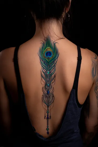 I think this tattoo is stunning because it feels both exotic and graceful. The peacock feather is often seen as a symbol of beauty and pride, and here it carries a luxurious energy that feels timeless. For me, the way it highlights the spine makes it look like wearable jewelry, and I love how it turns a classic motif into something truly striking.