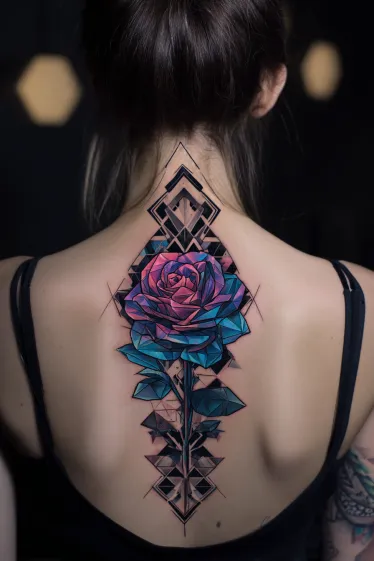 This tattoo showcases a bold rose in shades of pink and blue, framed by sharp geometric patterns that run along the spine. The petals are shaded with a gradient effect that makes the flower look both soft and futuristic, while the angular lines surrounding it add a striking sense of symmetry. The mix of organic beauty and geometric precision makes the design stand out as something truly unique.