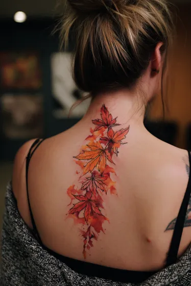 This tattoo displays a cascade of autumn maple leaves arranged down the spine in warm shades of red, orange, and gold. Each leaf is outlined with fine detail, and watercolor splashes in the background give the piece a soft, painted effect. The placement follows the curve of the back beautifully, making it look like the leaves are drifting gently in the wind.