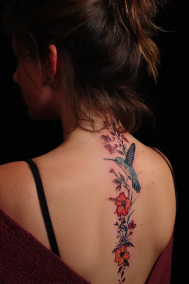 This tattoo shows a colorful hummingbird in flight, paired with a trail of flowers blooming down the spine. The bird is shaded in vibrant blues and greens, while the flowers are a mix of pinks, oranges, and purples, creating a lively and balanced design. The vertical placement follows the spine naturally, giving the piece a graceful flow that feels delicate yet eye-catching.