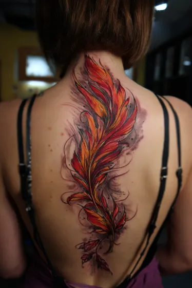 This tattoo shows a fiery feather flowing down the spine with bold shades of red, orange, and gold. The feather is designed with sweeping curves and fine details, giving it a sense of movement as if it s caught in a gentle breeze. Watercolor-style splashes and shading in the background add extra depth and intensity, making the colors appear even more vibrant.