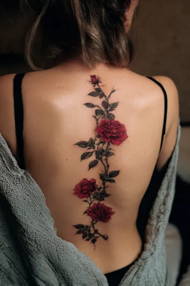 This tattoo features a trail of deep red roses climbing up the spine, connected by a stem of dark green leaves and delicate thorns. Each bloom is shaded with incredible detail, from the velvety petals to the layered texture that makes the flowers look almost real. The vertical arrangement enhances the natural curve of the back, giving the tattoo a graceful and balanced flow.
