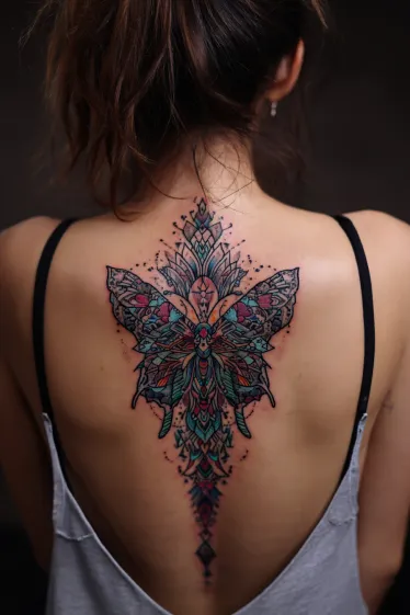 This tattoo features a large butterfly centered on the back, designed with intricate ornamental patterns that flow seamlessly into the spine. The wings are filled with detailed mandala-like shapes in shades of teal, red, and purple, giving the butterfly a rich and layered look. The symmetry is striking, and the vertical elements extend both above and below, enhancing the natural line of the spine.