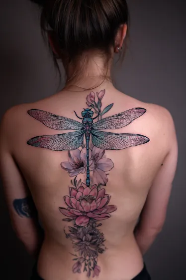 I love this tattoo because it feels so symbolic and serene. The dragonfly often represents transformation, while the lotus is tied to growth and rebirth, and together they tell such a powerful story. To me, the placement makes it even more special, almost like a vertical journey of beauty and strength running down the spine. It s elegant, meaningful, and absolutely stunning.