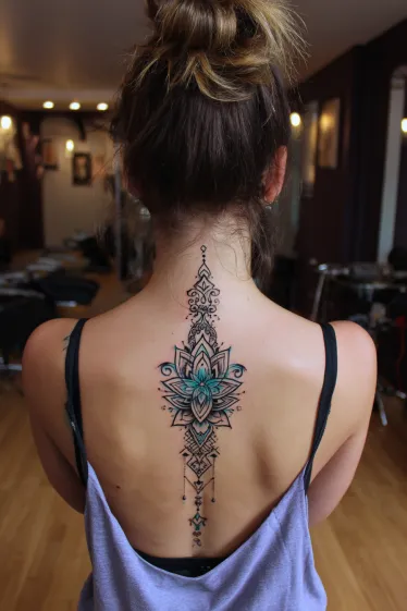 This tattoo combines the symmetry of a mandala with sharp geometric accents, running seamlessly down the spine. The central flower is shaded with deep teal and black tones, while delicate ornamental details frame it with elegance. The design tapers into fine dots and patterns, creating a balanced flow that feels both bold and graceful.