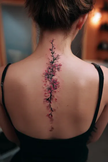 I think this tattoo is beautiful because it carries such a feminine and romantic energy. Cherry blossoms always remind me of fleeting beauty and renewal, and seeing them placed along the spine makes the design feel both elegant and symbolic. To me, it s the kind of tattoo that feels timeless yet fresh, perfect for someone who loves delicate details with a touch of meaning.