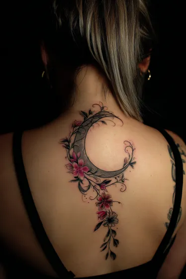 This tattoo shows a crescent moon resting at the top of the spine, beautifully wrapped in delicate pink flowers and leafy vines. The moon itself is shaded in soft grey tones with intricate detailing, while the blossoms add pops of color that make the whole design feel alive. The placement curves gently down the spine, giving the tattoo both balance and flow.