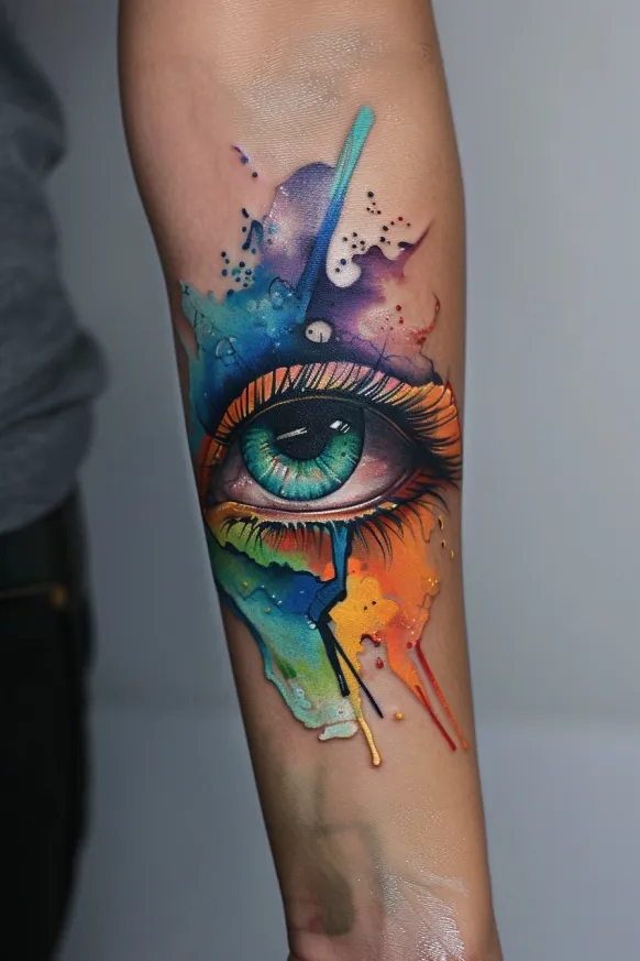 This watercolor eye tattoo is pure artistry. The vibrant blues, greens, oranges, and purples blend seamlessly, creating a bold, painterly effect. The iris itself is a mesmerizing oceanic turquoise, surrounded by a deep black pupil that feels almost lifelike. Splashes of paint seem to drip and burst outward, giving the design an effortlessly creative feel. The way the colors blend makes it look as if the eye is caught in an explosion of pure energy and emotion.