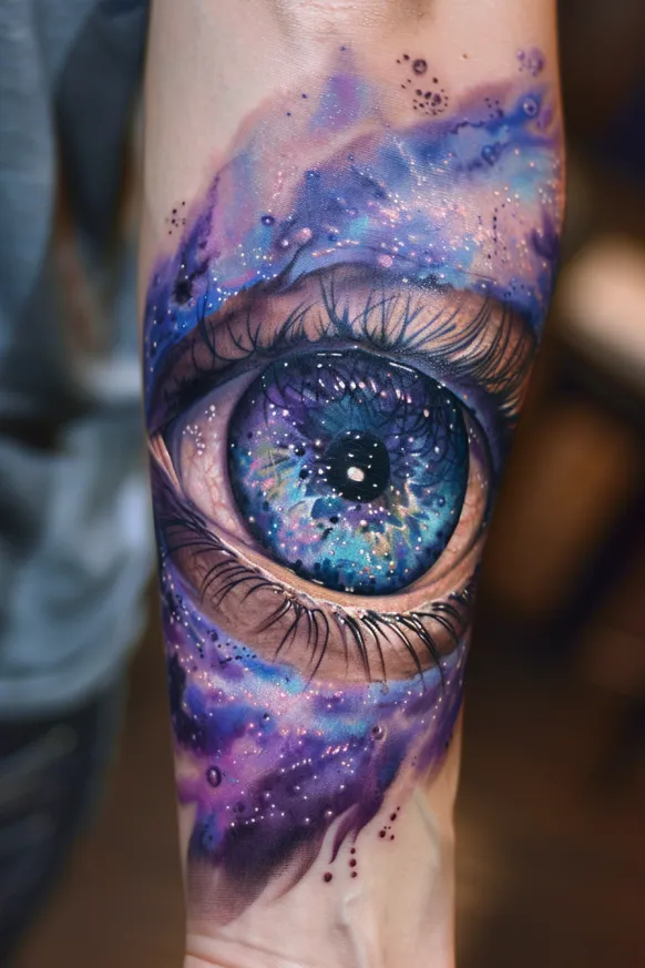 This galaxy-inspired eye tattoo is a dream for anyone who loves a little cosmic mystery. The deep blue and purple hues swirl together, creating a celestial masterpiece that looks like a portal to another world. Tiny white stars scatter across the design, giving it an ethereal glow. The iris itself is a universe of colors, with a hypnotic mix of blues, purples, and blacks that make it feel like the cosmos is staring back. Soft shading around the eye blends seamlessly into the watercolor-style galaxy, making the whole piece feel fluid and organic.