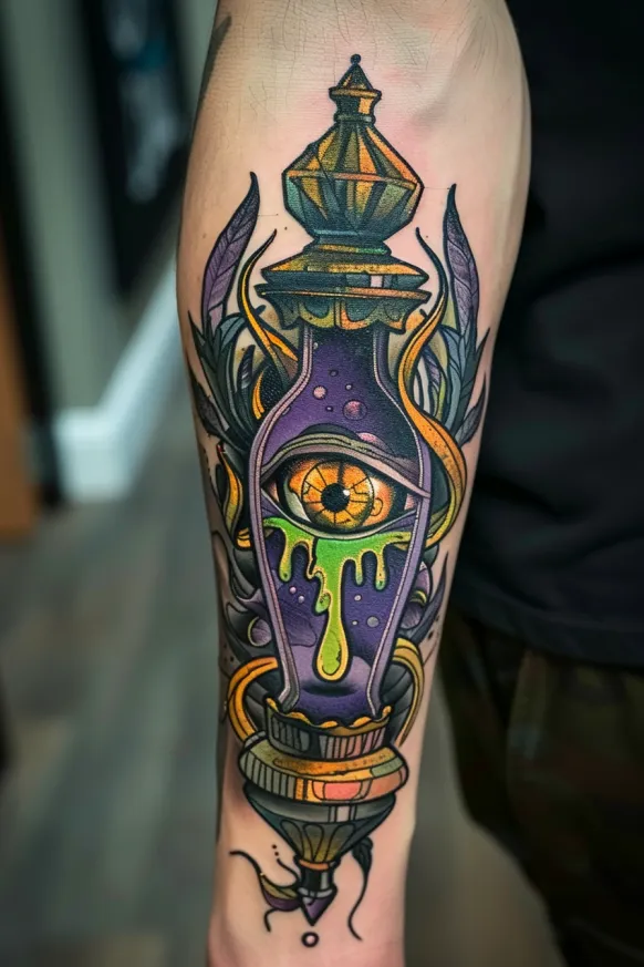 This ornate and surreal lantern eye tattoo blends gothic and fantasy aesthetics into a spellbinding design. The glass lantern casing holds a striking, golden-hued eye, dripping with eerie neon green liquid that adds a hauntingly beautiful touch. Shades of deep purples, bold blacks, and shimmering gold accents create a magical, otherworldly vibe. Delicate filigree and botanical details weave around the lantern, giving it an enchanted, vintage charm.