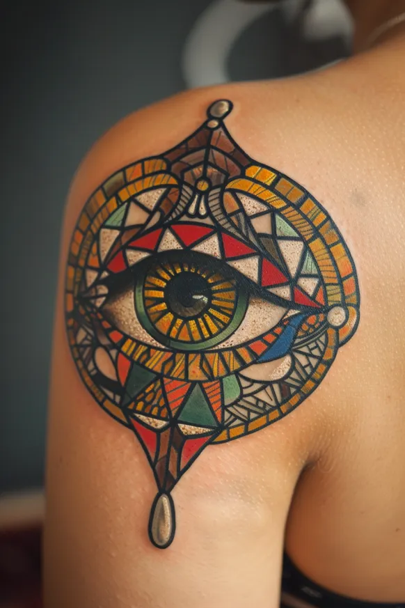 I am completely obsessed with how this tattoo looks both ancient and futuristic at the same time. The stained glass effect makes it feel like something sacred, almost as if the eye is a watchful protector. The blend of colors is so warm and rich, giving it an artistic yet timeless energy. This isn t just a tattoo, it s a work of art, and I can t stop staring at it.
