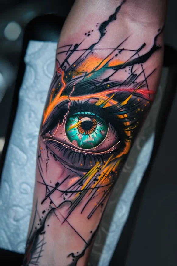 This electrifying abstract eye tattoo is pure energy on skin. The striking turquoise iris burns with intensity, standing out against the chaotic splashes of neon oranges, yellows, and blacks. Sharp, jagged lines streak across the design, creating a sense of movement, as if the eye is pulsing with raw power. The contrast between the realistic detailing of the eye and the bold, sketch-like elements around it makes this tattoo feel both futuristic and rebellious.