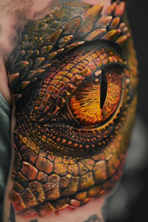 This dragon eye tattoo looks like it belongs to a mythical beast watching from beneath the skin. The hyper-realistic scales create a rich, textured effect, making the tattoo feel almost alive. The fiery orange iris burns with intensity, with a sharp, slit pupil that adds a fierce and untamed energy. The shading and highlights on the scales add depth, giving the impression of rugged, ancient skin. Every small detail, from the reflections in the eye to the intricate patterns on the scales, makes this tattoo a jaw-dropping piece of art.