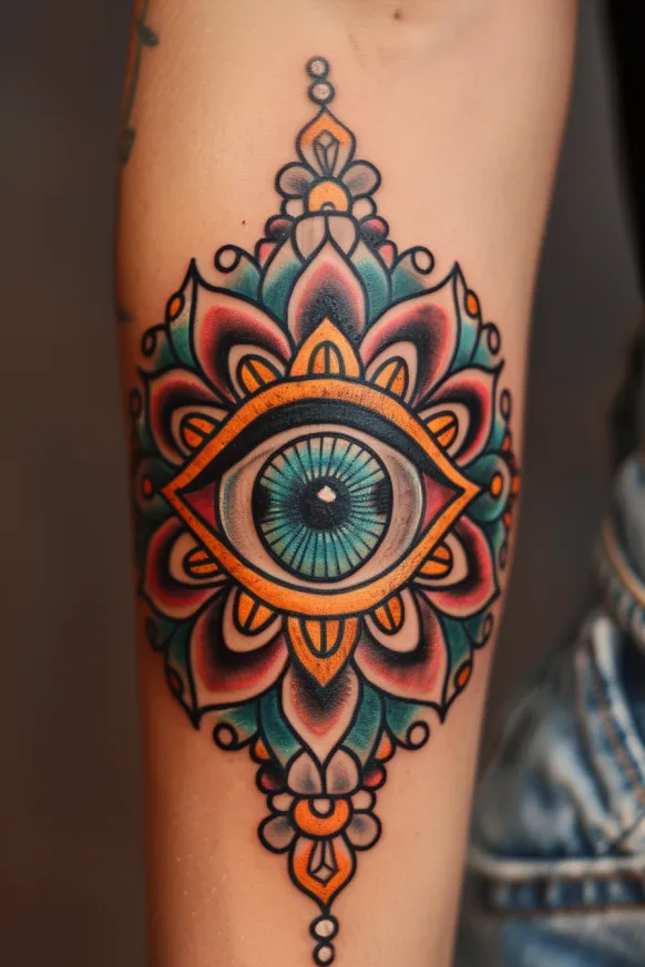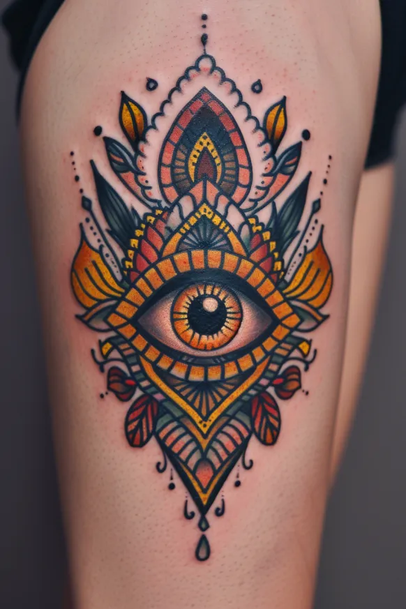 This stunning mandala eye tattoo blends bold geometry with rich color gradients for a truly mesmerizing look. The central blue-green iris pops against the deep oranges and golds framing it, creating an almost hypnotic effect. Surrounding petal-like patterns form a layered mandala design, adding symmetry and balance. The ornamental detailing at the top and bottom makes the tattoo feel like a sacred symbol, exuding both elegance and power.