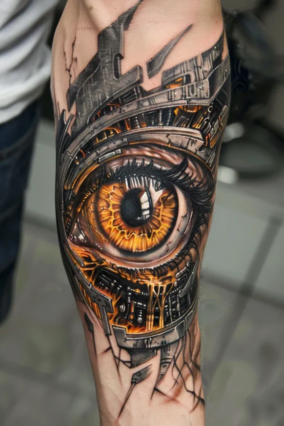 There s something incredibly powerful about this tattoo. It has a bold, sci-fi aesthetic that feels like it belongs in a futuristic world. The contrast between flesh and metal makes it feel almost symbolic like a representation of strength, resilience, and evolution. I love how the detailed linework and deep shadows create a sense of movement, as if the eye is scanning its surroundings. This is the kind of tattoo that makes people stop and stare.