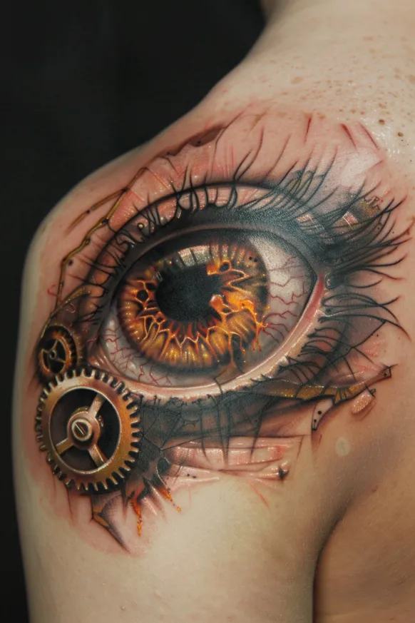 I am completely obsessed with the way this tattoo brings steampunk fantasy to life. The combination of hyper-realistic shading and metallic elements makes it feel both otherworldly and artistic. There s something so fascinating about the idea of a mechanical eye with a soul, like a window into a futuristic world. It s bold, unique, and impossible to look away from just the way a great tattoo should be.