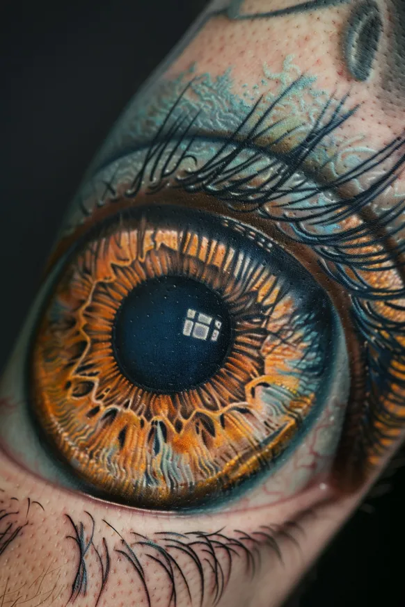 This ultra-realistic eye tattoo is nothing short of mesmerizing. The iris glows with shades of gold, amber, and deep orange, creating an almost hypnotic effect. The fine details in the pupil, with that tiny light reflection, make it feel as if the eye is truly alive. Every eyelash is meticulously inked, adding a striking level of realism. The surrounding skin tones and subtle hints of blue and green hues give the design extra dimension, making the entire piece pop in an almost surreal way.