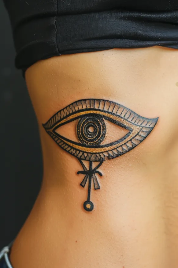 This minimalist geometric eye tattoo is a perfect example of how simple designs can still be incredibly striking. The clean black linework forms a structured yet artistic eye, complete with symmetrical detailing and subtle dot work that adds depth. The unique hanging ornament below the eye gives it a sacred, almost mystical feel, making it look like an amulet or a protective symbol. Positioned on the ribcage, this design has a delicate and elegant presence.