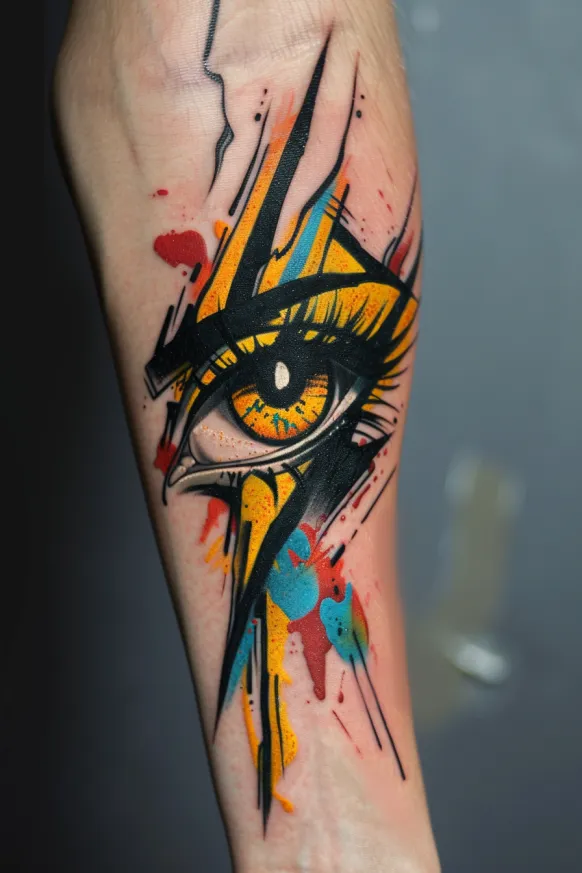 This bold abstract eye tattoo is bursting with energy and creativity. The sharp black lines and jagged streaks give it an edgy, rebellious look, while the vivid yellow and red tones make it pop right off the skin. The eye itself is mesmerizing, glowing with deep golden hues that contrast beautifully against the surrounding chaos. Splashes of blue and red add an almost graffiti-like effect, making this piece feel like a mix of modern art and raw emotion.
