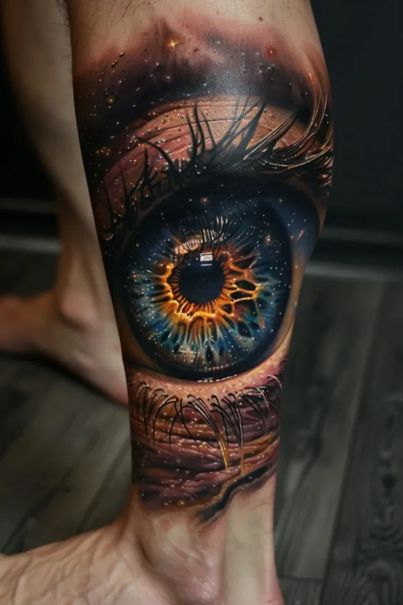 This galaxy-inspired eye tattoo feels like a portal to another universe. The iris burns with fiery oranges and deep blues, resembling the swirling gases of a distant nebula. Tiny stardust details and cosmic reflections make it feel as if the eye holds an entire galaxy within. The shading around the lashes adds intense depth, making the design incredibly realistic yet otherworldly at the same time.