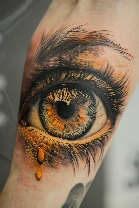 This hyper-realistic eye tattoo looks almost too real to be ink. The intricate details in the iris, with those warm golden hues and fiery orange flecks, make it feel like the eye is staring right through the skin. The delicate shading around the eyelashes and the soft glow of the highlights add incredible depth. The most striking detail has to be the golden tears, creating an almost mystical or emotional effect that makes this design impossible to ignore.