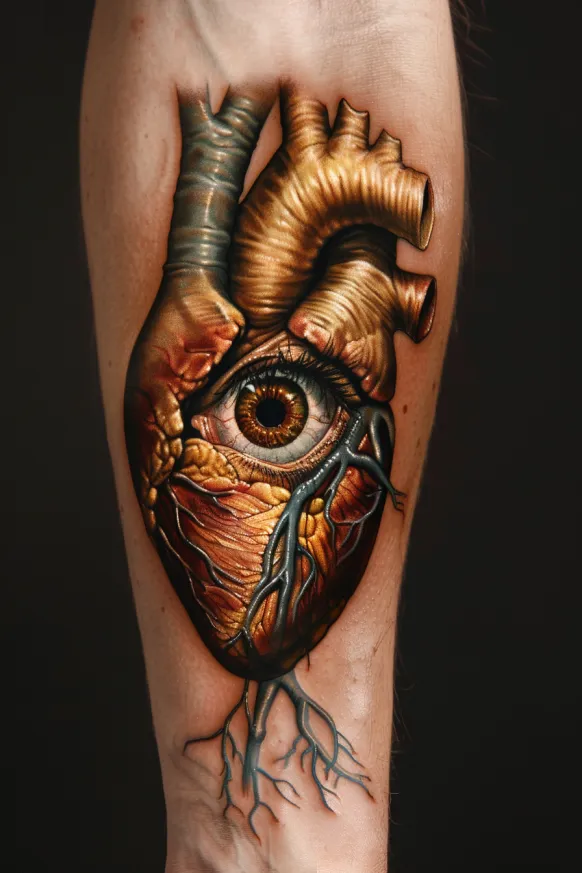 This anatomical heart and eye tattoo is a stunning fusion of realism and surrealism. The hyper-detailed heart looks almost three-dimensional, with deep golden and brown hues giving it a rich, lifelike texture. At its center, a piercing, amber-colored eye stares outward, as if seeing straight into the soul. Delicate veins extend down the arm, adding an organic, almost root-like effect that enhances the design s depth and symbolism.