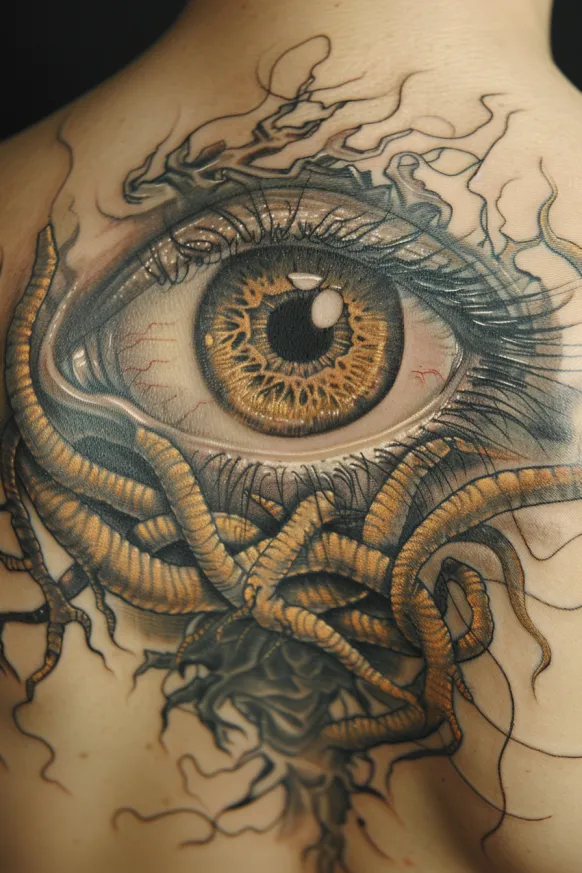 This surreal eye tattoo blends hyper-realism and fantasy in the most striking way. The golden-brown iris glows with an eerie intensity, drawing attention to every tiny detail, from the intricate veins in the sclera to the soft shading around the lashes. But the real magic happens with the twisting, root-like tentacles that seem to emerge from beneath the skin, giving the design an almost otherworldly feel. The delicate blackwork and fine lines create a hauntingly organic look, as if the eye is deeply connected to something far beyond the surface.