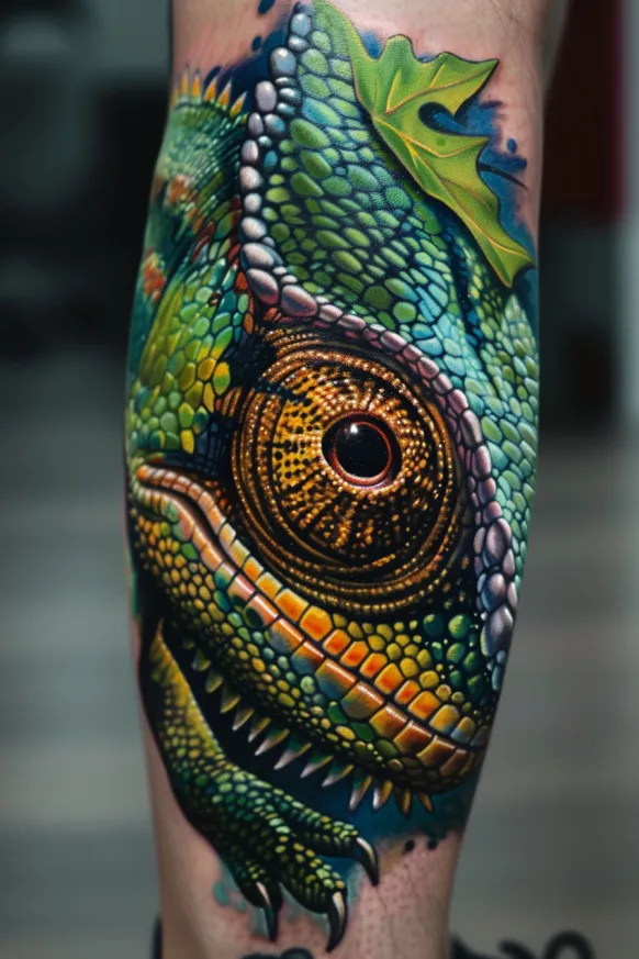 This vibrant chameleon eye tattoo looks almost alive with its incredibly detailed scales and bold colors. The mix of emerald greens, bright yellows, and deep oranges creates an eye-catching contrast that enhances the lifelike effect. The intricate texture of the reptilian skin is shaded to perfection, making every tiny scale pop. The eye itself is a rich, glowing amber, drawing attention with its hypnotic depth. A small green leaf at the top adds a natural element, blending seamlessly into the overall design.