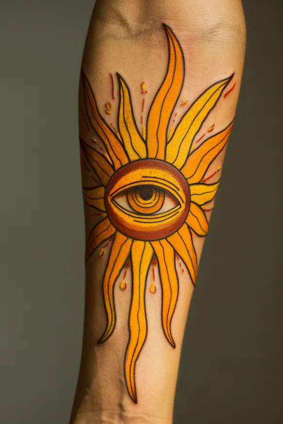 I love how this tattoo gives off such a powerful yet warm vibe. The combination of an all-seeing eye with the sun s burning presence makes it feel deeply symbolic and mystical. It s bold enough to turn heads but still has a timeless quality that makes it effortlessly cool. Perfect for someone who loves celestial energy, ancient symbols, or just wants an eye tattoo that truly shines.