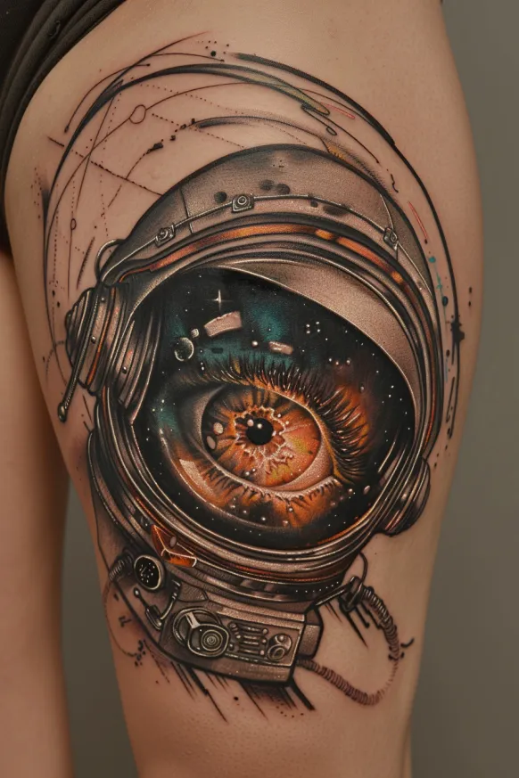 This astronaut helmet eye tattoo is a perfect blend of sci-fi and surrealism. The hyper-realistic golden iris peers out from inside a detailed space helmet, reflecting the vastness of the cosmos. Tiny stars, planets, and galaxies swirl in the eye, making it feel like a window into the universe. The fine line orbital patterns surrounding the design add an extra futuristic touch, giving it a feeling of endless exploration and curiosity.