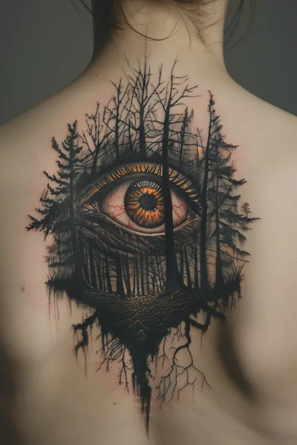 I love how this tattoo captures a sense of mystery and connection to nature. The mix of realism and dark fantasy makes it feel almost like a portal into another world. There s something about the contrast between the glowing eye and the deep, shadowy trees that feels both intense and calming. It s the perfect tattoo for someone who feels at home in the woods or has a soul that craves the unknown.