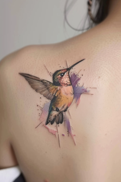 A hummingbird on the shoulder, colored like a watercolor painting. Its wings are mid-flight, and colors splash outside the lines. Hummingbirds mean joy and quickness.