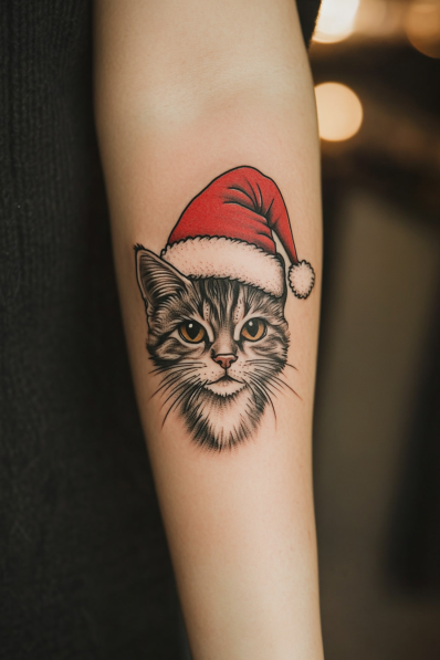 Honestly, this tattoo is a holiday cat lover s dream come true! It s playful and festive, with just the right amount of sass that only a cat in a Santa hat could pull off. The combination of realism in the cat s face and the cartoon-like pop of the hat makes it eye-catching and full of character. If you adore cats and want to celebrate the holidays in the cutest way possible, this festive feline is the ultimate way to do it.