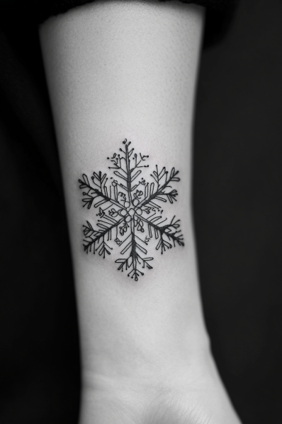 This tattoo captures the elegance of a snowflake in beautiful, detailed black line work. Each branch of the snowflake is uniquely decorated, with delicate lines that give it a handcrafted, almost lace-like appearance. It s both simple and complex, with symmetrical branches that radiate wintery charm without overwhelming the eye. The design strikes a perfect balance between minimalism and intricate detail, making it feel refined yet festive.