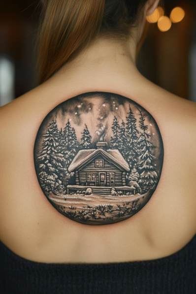 This captivating tattoo portrays a serene winter cabin scene enclosed in the perfect shape of a snow globe. The cozy log cabin sits snugly amidst towering, snow-covered pines, with a delicate wisp of smoke rising from the chimney, creating a warm and inviting vibe. Soft snowflakes fall around the cabin, beautifully shaded in grayscale to give a frosty and enchanting feel. The globe s circular border makes it look like a classic holiday keepsake, capturing the essence of a snowy, magical night.