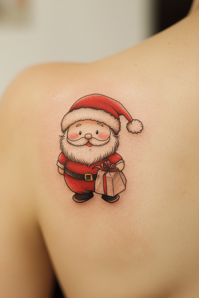 This adorable tattoo brings Santa Claus to life in the cutest way possible, featuring a cheerful, chubby Santa with rosy cheeks, a fluffy white beard, and his signature red suit. He s holding a neatly wrapped present, ready to spread holiday cheer to everyone he meets. The soft colors and simple lines give the design a playful and heartwarming feel, making it perfect for anyone who loves the magic of Christmas. The tiny details, like the puff on his hat and the twinkle in his eyes, make Santa look extra joyful and full of festive spirit.