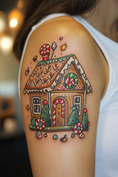 This charming tattoo showcases an adorable gingerbread house straight out of a holiday fairy tale. The house is decorated with colorful candies, peppermint swirls, gumdrops, and frosting dripping from the roof like fresh snow. Little candy canes frame the doorway, while two cheerful Christmas trees made of sugar stand guard outside. Sprinkles of candy stars and festive confetti float around the house, giving it a playful, magical vibe that screams holiday spirit.