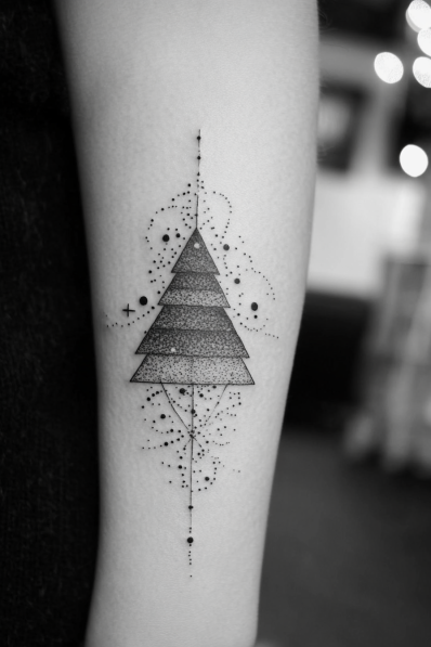 This tattoo showcases a modern, geometric take on the classic Christmas tree. Composed of layered triangular shapes, each segment features fine dotwork shading that adds a soft gradient effect. Surrounding the tree is a mesmerizing arrangement of tiny dots, crosses, and abstract celestial symbols, giving the whole piece a mystical, almost cosmic vibe. It s a minimalistic design that feels contemporary, yet the scattered details bring a sense of enchantment and holiday magic.