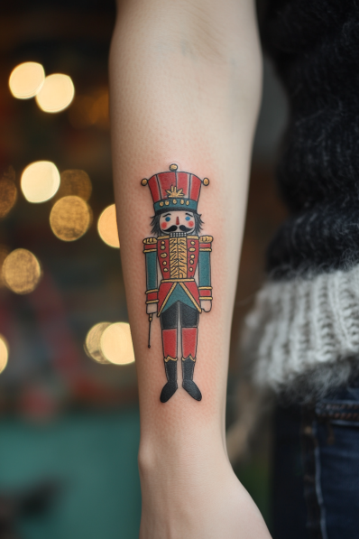 I m totally loving how this tattoo gives a nod to one of the most iconic symbols of the season. It feels straight out of a beloved holiday ballet or a treasured decoration from childhood. There s something magical about Nutcrackers they re fierce protectors of the Christmas spirit, and having one inked on you is like carrying a piece of that enchantment all year round. If you re all about keeping the holiday spirit alive, this bold and charming design is a total showstopper!
