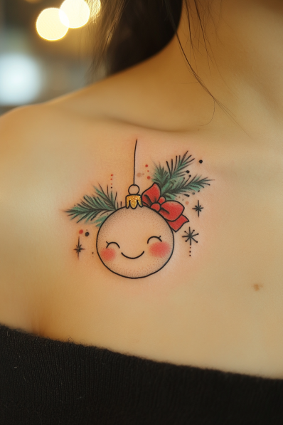 This cheerful tattoo features a smiling Christmas ornament hanging from a festive pine branch, adorned with a bright red bow. The ornament s happy expression, complete with rosy cheeks, adds a playful, lighthearted vibe that s sure to brighten anyone s day. Delicate stars and sparkles surround the design, making it feel extra magical and full of holiday cheer. The soft color palette of greens and reds contrasts beautifully against the ornament s simple, rounded shape, giving it a whimsical, cartoon-like feel.