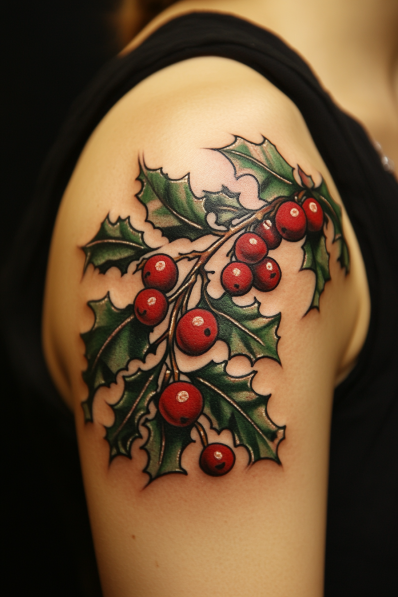 I think this tattoo is beautifully bold and unapologetically festive. It s the kind of piece that makes you think of cozy evenings, crackling fires, and holiday merriment. What I love most is how the traditional style enhances the timeless nature of holly it feels nostalgic yet strikingly cool. If you re someone who wants to carry the spirit of the holidays with you but also loves the classic, eye-catching ink look, this tattoo definitely delivers.