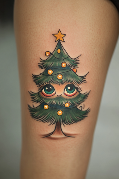 I m completely smitten with how endearing this little tree is! It s like a holiday character straight out of a feel-good animated film, ready to spread cheer wherever it goes. The big, expressive eyes give it so much life and warmth, and the cartoonish details make it impossible not to smile. If you want a tattoo that s bursting with holiday spirit and guaranteed to make people say aww, this cute Christmas tree is an absolute delight.