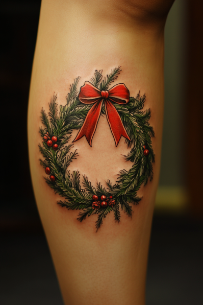 I m seriously impressed with how this tattoo captures the festive spirit in such a timeless way. It s like wearing a piece of Christmas on your skin, ready to spread holiday joy all year long. The attention to detail makes it feel almost three-dimensional, and let s be real who doesn t love the cozy vibes of a wreath? If you re someone who waits all year for the holiday season and wants to keep that feeling alive, this tattoo hits all the right notes. It s festive, elegant, and just the right amount of jolly!