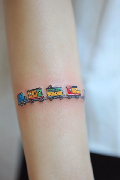 This playful tattoo features a miniature Christmas train, each car decked out in bright, cheerful colors. The locomotive leads the way in festive red and yellow, followed by a line of cute train cars, each carrying its own holiday charm. The simple yet charming design wraps around the arm like a tiny, festive parade, evoking a sense of childlike wonder and joy. The vibrant hues make the train stand out, and the attention to detail in the tiny wheels and windows adds a whimsical touch.