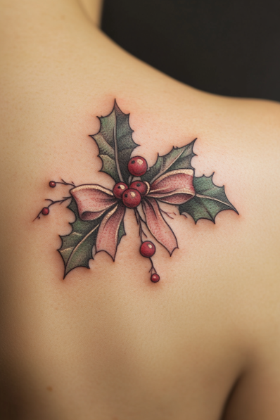 This lovely tattoo features a sprig of holly adorned with lush green leaves and vibrant red berries, perfectly complemented by a soft, flowing pink ribbon. The leaves have delicate, realistic shading, giving them a rich texture, while the berries gleam with a glossy, lifelike finish. The ribbon ties everything together beautifully, adding a touch of elegance and grace to the classic holiday theme. The soft, subtle colors and smooth lines make this piece timeless and classy.