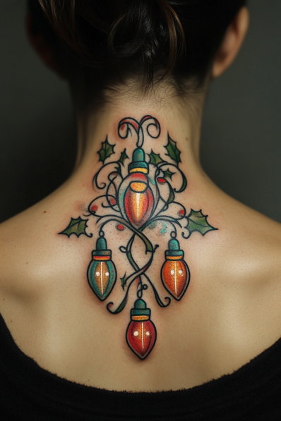 This eye-catching tattoo features a string of vintage-style Christmas lights arranged in an elegant, ornamental pattern. The glowing bulbs are inked in vivid shades of red, orange, and teal, each surrounded by a subtle halo effect that makes them appear as though they re actually lit. Twisting, swirling black lines connect the bulbs in a way that s almost vine-like, and accents of holly leaves and berries add an extra dash of holiday charm. The whole design is perfectly placed to create a striking centerpiece, with a touch of Victorian flair.