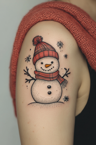 This heartwarming tattoo brings a classic snowman to life with a playful and endearing touch. Our frosty friend is wrapped up snugly in a cozy, red-striped scarf and a matching beanie complete with a fluffy pom-pom. The snowman s twig arms reach out as if ready for a warm holiday hug, while a carrot nose and a cheerful, coal-smile expression make it irresistible. Soft snowflakes dance around, adding a wintery sparkle to the scene, and the subtle dotwork shading makes the snowman look like it s freshly built from powdery snow.