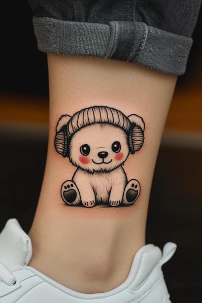 This heart-melting tattoo features an impossibly cute polar bear, cozied up in warm earmuffs, ready to brave the winter chill. The bear s soft, fluffy fur is detailed with gentle shading, and its little paws are tucked beneath its round body, giving off ultimate snuggle vibes. The earmuffs, complete with padded detail, add a playful and cozy winter touch to this already irresistible design. With rosy cheeks and big, innocent eyes, this polar bear looks like it just stepped out of a holiday storybook.