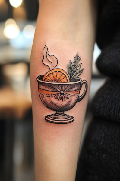 This warm and inviting tattoo features a steaming cup of mulled wine, complete with a slice of orange and a sprig of rosemary peeking out. The vintage-style cup, detailed with elegant linework and soft shading, gives off an old-world charm. The swirling steam rising from the hot beverage almost feels fragrant, making you think of spices and holiday gatherings. The orange slice and rosemary add a festive touch, giving the piece a pop of color that enhances the cozy holiday vibe.