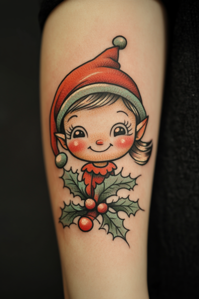 I have to say, this tattoo is just full of holiday magic! It s like a reminder of all the joy and excitement that comes with Christmas, from decorating the tree to waiting for Santa s visit. The cheerful expression on the elf s face is contagious, and the whole design gives off a retro vibe that makes it feel timeless and fun. If you re looking for something playful, nostalgic, and full of festive charm, this little elf is sure to bring smiles wherever you go.
